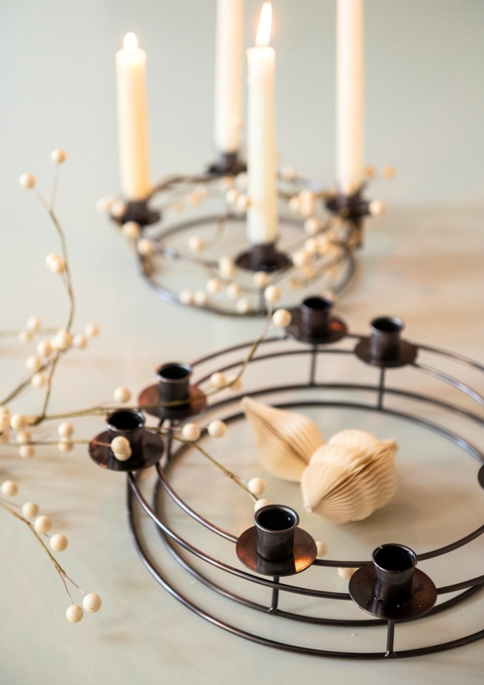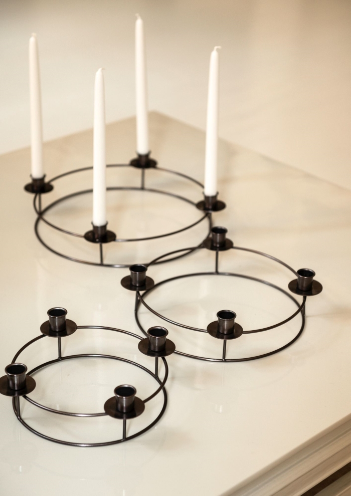 Adventski svijećnjak s crnim metalnim premazom. Ovaj prekrasan komad ima ručno oslikanu završnu obradu u vintage stilu i predviđen je za 4 standardne uske svijeće (promjera približno 22 mm).